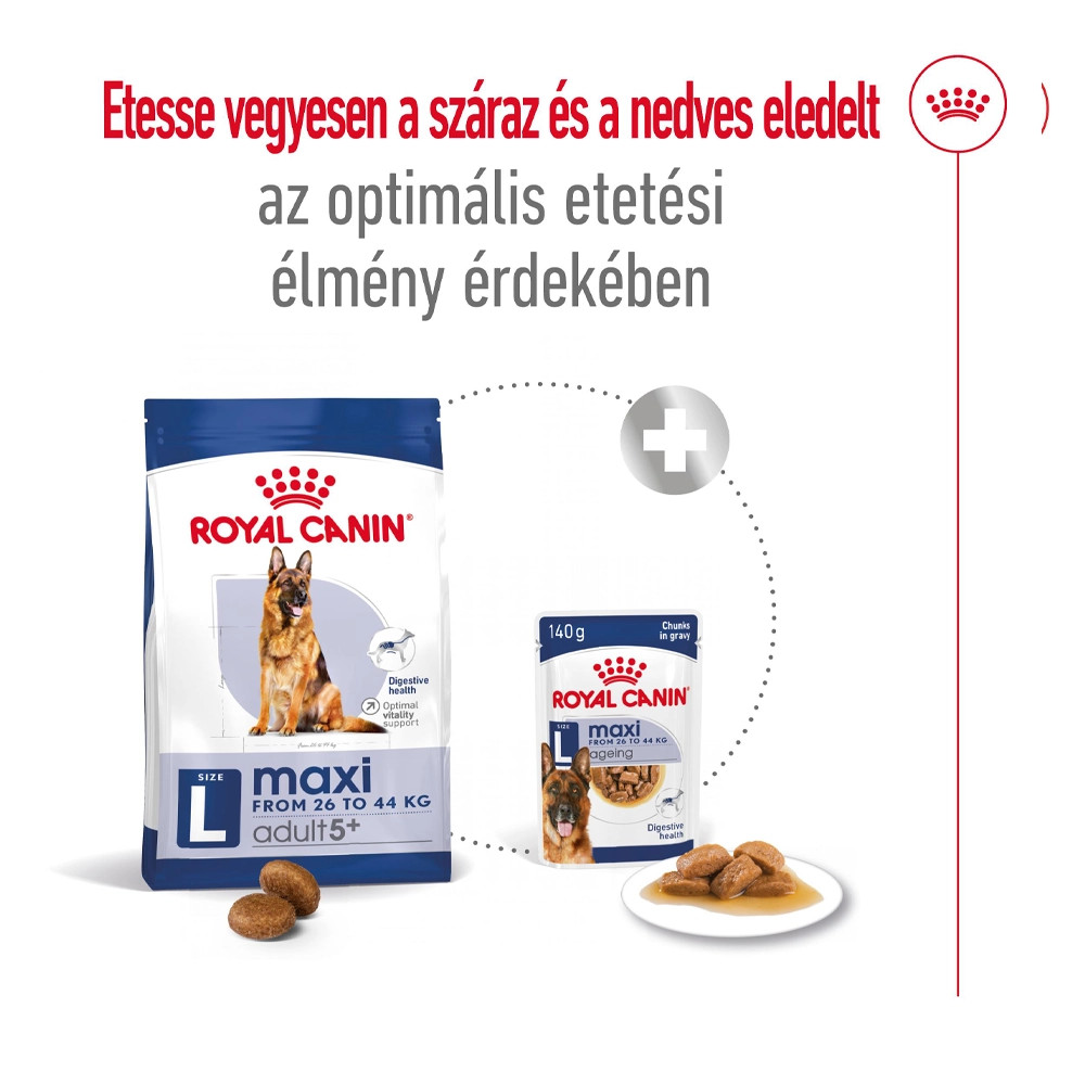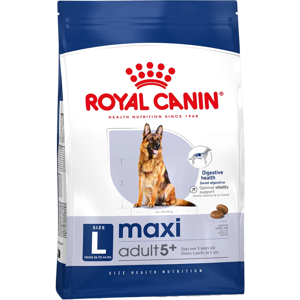 A ROYAL CANIN Maxi Adult 5+ egy táplálási szempontból teljes értékű és kiegyensúlyozott formula kutyák számára, 5 éves kortól, amelyet kifejezetten a nagytestű kutyája sajátos igényeinek kielégítésére, illetve a késő felnőttkori évei alatt történő támogatására terveztek.