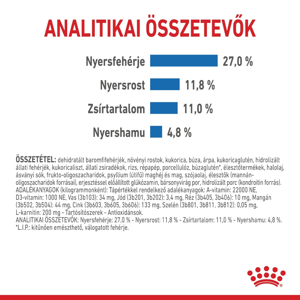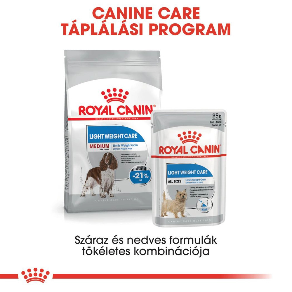 Royal Canin Medium Light Weight Care Száraz Kutyatáp • Korlátozza a súlygyarapodástSzámos kutya túlsúlyos, és emiatt szenved a plusz kilók által az ízületekre rótt terheléstől. Ezzel az ideális testsúly megőrzését célzó, kitűnő minőségű tápanyagokat tartalmazó táppal segítsen kutyájának abban, hogy sportos maradjon és megőrizze jó formáját.A 11 kg és 35 kg közötti testsúlyú kutyák számára alkalmas ROYAL CANIN Light Weight Care Medium segít kutyájának abban, hogy továbbra is könnyen álljon a mancsain.Ez a különleges formula omega-3 zsírsavakat – köztük EPA-t és DHA-t – tartalmaz, hogy segítsen támogatni a kutya ízületeit.A ROYAL CANIN Light Weight Care Medium táp a szokásosnál jelentősen alacsonyabb zsírtartalmú, hogy segítsen a kutyának megőrizni ideális testsúlyát.A Royal Canin nagyon komolyan veszi a fehérjéket. Ez a formula nagy mennyiségben tartalmaz kitűnően emészthető fehérjéket annak biztosítása érdekében, hogy az Ön kutyája a zsír- és a kalóriafelvétel csökkenése ellenére megőrizze izomtömegét.Mi több, az oldható és az oldhatatlan rostok optimális kombinációja elősegíti a teltségérzetet, emellett rendszeres és egészséges bélpasszázst a jobb emésztés érdekében.A Light Weight Care táplálási programunk két komponensből áll: száraz táp ropogós tápszemcsékkel és finom pástétom, tasakos kiszerelésben – mindkettő teljes tápértékű, és tökéletesen kiegészítik egymást. Miért ne próbálná ki a pástétomot a száraz táphoz adott ízletes „feltétként”?Nem csak mi mondjuk: a Royal Canin kenneljeiben tudományosan tesztelt ROYAL CANIN Light Weight Care Medium 21%-kal kevesebb zsírt tartalmaz, mint egy normál felnőtt táp. Ez azt jelenti, hogy a ROYAL CANIN Light Weight Care Medium etetésével elért eredmények bizonyítottan sikeresek.Összetétel: Dehidratált baromfifehérjék, növényi rostok, kukorica, búza, árpa, kukoricaglutén, hidrolizált állati fehérjék, kukoricaliszt, állati zsiradékok, rizs, répapép, porcellulóz, búzaglutén*, élesztőtermékek, halolaj, ásványi anyagok, frukto-oligoszacharidok, psyllium (útifű) maghéj és mag, szójaolaj, élesztők (mannán-oligoszacharidok forrásai), erjesztéssel előállított glükózamin, bársonyvirág por, hidrolizált porc (kondroitin forrás)*L.I.P.: kitűnően emészthető, válogatott fehérjeAnalitikai összetevők: Nyersfehérje: 27,0 %, Nyersrost: 11,8 %, Zsírtartalom: 11,0 %, Nyershamu: 4,8 %Tápértékkel rendelkező adalékanyagok/kg: A-vitamin: 22000 NE, D3-vitamin: 1000 NE, Vas (3b103): 34 mg, Jód (3b201, 3b202): 3,4 mg, Réz (3b405, 3b406): 10 mg, Mangán (3b502, 3b504): 44 mg, Cink (3b603, 3b605, 3b606): 133 mg, Szelén (3b801, 3b811, 3b812): 0,05 mg, L-karnitin: 200 mgTechnológiai adalékanyagok/kg: Tartósítószerek, Antioxidánsok