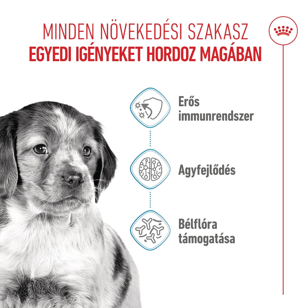 Royal Canin Medium Puppy (11-25 kg) Száraz Kutyatáp • Erős immunrendszer• Az agy fejlődése• Mikrobiom támogatása• Optimális energiatartalomA kölyökkor a nagy változások időszaka. Közepes testű kölyökkutyájának intenzív növekedési szakasza során elegendő kalóriára és megfelelő tápanyagokra van szüksége az egészséges növekedéshez. Ebben a növekedési fázisban fejlődnek ki kölyökkutyája csontjai, izmai, érzékszervei és idegrendszere. Ekkor gyengül meg az anya kolosztrumával felvett ellenanyagok szintje, ami azt jelenti, hogy a kölyökkutyáknak optimális fehérjemennyiségre van szükségük, hogy kifejlődjön saját immunrendszerük.A ROYAL CANIN Medium Puppy tápot kifejezetten a közepes testű kölyökkutyák tápanyagszükségleteit szem előtt tartva fejlesztettük ki. Összetétele megfelelő a 2-12 hónapos kölyökkutyák számára, amelyeknek 11-25 kg felnőttkori testsúlyt kell elérniük.Ez az egyedi étrend olyan tápanyagokat tartalmaz, mint a C- és E-vitamin, hogy támogassa a kölyökkutyák természetes védekezőrendszerét, míg immunrendszerük fejlődésben van.Omega-3 zsírsavakban (pl. DHA) gazdag, amely tudományosan bizonyított módon támogatja a kölyökkutya agyának egészséges fejlődését.A jótékony hatású prebiotikumok (pl. FOS, MOS és cukorrépapép) és kitűnően emészthető fehérjék kombinációjának köszönhetően a ROYAL CANIN Medium Puppy segít támogatni a bél-mikrobióta (bélflóra) egészséges egyensúlyát is a megfelelő emésztés érdekében.Továbbá a formula optimális energiatartalommal rendelkezik, amelyet úgy fejlesztettünk ki, hogy kielégítse a növekedésben lévő közepes testű kölyökkutyák energiaigényét.A ROYAL CANIN Medium Puppy tápszemcséit kifejezetten a közepes testű kölyökkutyák szájának méretéhez fejlesztettük ki. Elég nagynak kell lennie, hogy elősegítse elfogyasztását, de nem túl nagynak, mert akkor a kölyökkutya vonakodni fog az evéstől. Támogatja továbbá a fogak egészségét, köszönhetően mechanikus fogtisztító hatásának, miközben a kölyökkutya rág.Tudta, hogy a kölyökkutyák tápanyagszükséglete változik, ahogy növekednek? Mire közepes testű kölyökkutyája eléri a 12 hónapos kort, olyan étrendre van szüksége, amely egyedileg igazított, hogy megfeleljen a tápanyagszükségleteinek felnőtt kutyaként. Ebben a szakaszban át lehet térni a ROYAL CANIN Medium Adult tápra, amely száraz tápszemcseként vagy nedves falatokként, szószban kapható.A Royal Caninnál elkötelezettek vagyunk egy jobb világ megteremtése iránt a macskák és a kutyák számára. Több mint 50 éve dolgozunk szoros együttműködésben tenyésztőkkel, állatorvosokkal és kisállatszakértőkkel, megosztva egymással a szakmai tudást és a tudományos kutatásokat, hogy megteremtsük az egyedi, precíz, tápanyagokkal kapcsolatos megoldásokhoz való elkötelezett hozzáállást.Valamennyi termékünk esetében átfogó minőség-ellenőrzési eljárást folytatunk le, biztosítva az eledelek optimális minőségét. Amikor közepes testű kölyökkutyája ROYAL CANIN Medium Puppy tápot eszik, teljes értékű és kiegyensúlyozott táplálékot kap.Összetétel: Dehidratált baromfifehérje, állati zsiradékok, kukorica, búzaglutén*, cukorrépapép, búzaliszt, kukoricaglutén, hidrolizált állati fehérjék, kukoricaliszt, rizs, búza, ásványi sók, szójaolaj, élesztőtermékek, halolaj, frukto-oligoszacharidok, hidrolizált élesztő (mannán-oligoszacharidok és béta-glükánok forrása) (0,29 %), algaolaj Schizochytrium sp. (DHA forrás), Yucca schidigera lé, bársonyvirág por*L.I.P.: kitűnően emészthető, válogatott fehérjeAnalitikai összetevők: Nyersfehérje: 32,0 %, Zsírtartalom: 20,0 %, Nyershamu: 8,2 %, Nyersrost: 1,7 %, Omega-3 zsírsav (DHA): 0,17 %, E vitamin: 500 mg/kg, C vitamin: 400 mg/kgMetabolizálható energia: 4102 kcal/kgTápértékkel rendelkező adalékanyagok/kg: A vitamin: 15500 NE, D3 vitamin: 1000 NE, Vas (3b103): 37 mg, Jód (3b201, 3b202): 3,8 mg, Réz (3b405, 3b406): 12 mg, Mangán (3b502, 3b504): 49 mg, Cink (3b603, 3b605, 3b606): 130 mg, Szelén (3b801, 3b811, 3b812): 0,06 mgTechnológiai adalékanyagok/kg: Üledékes eredetű klinoptilolit: 10 g, Tartósítószerek, Antioxidánsok