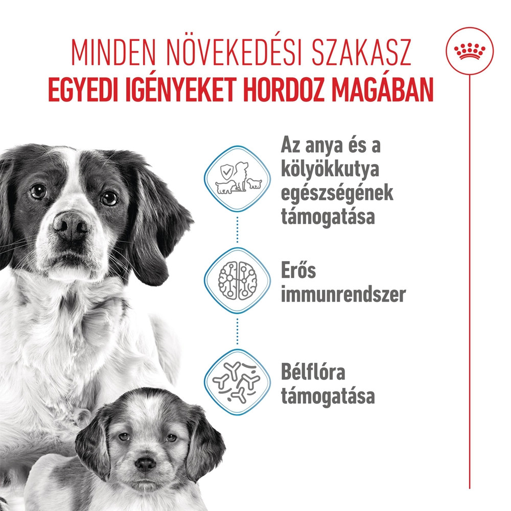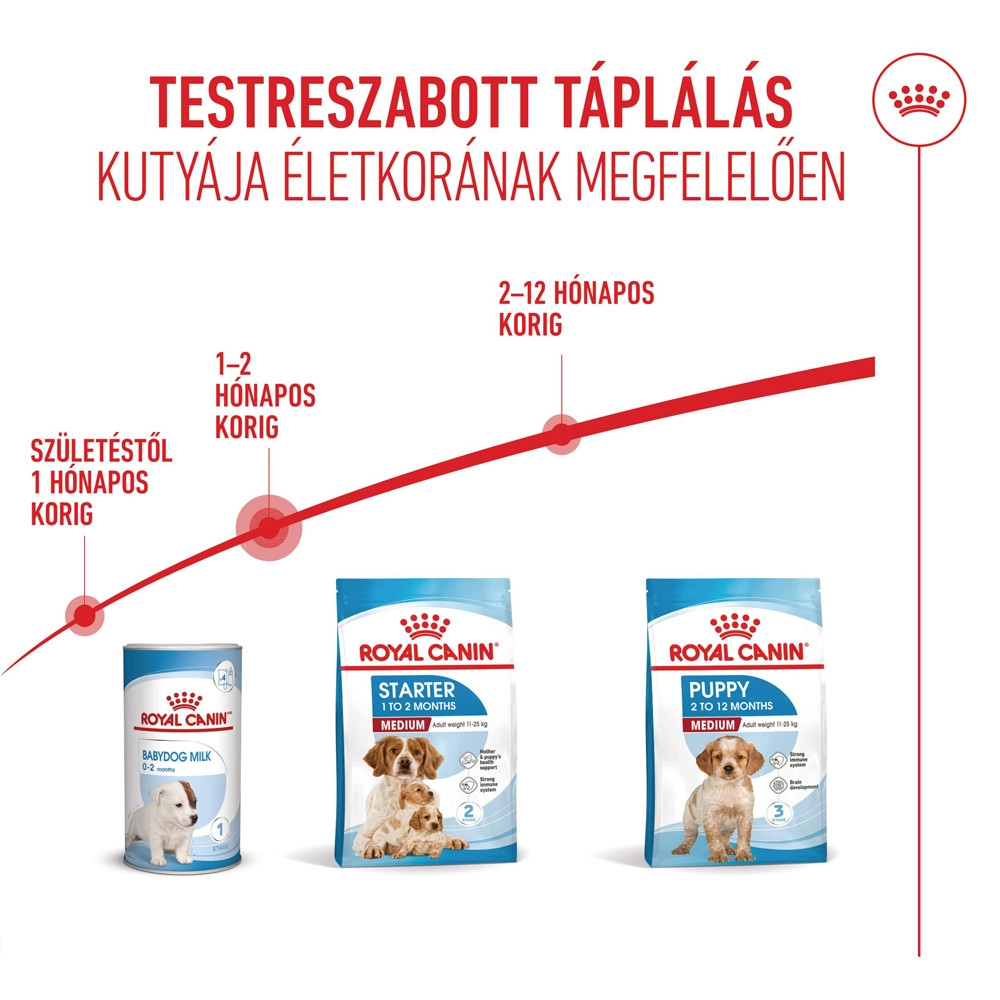 A ROYAL CANIN Medium Starter Mother & Babydog tápot kifejezetten az anyakutyák és kölyökkutyáik tápanyagszükségleteit szem előtt tartva fejlesztettük ki. A formula megfelelő a 11 és 25 kg közötti testtömegű, közepes testű felnőtt kutyák és az elválasztás alatt levő kölyökkutyák számára 2 hónapos korig.