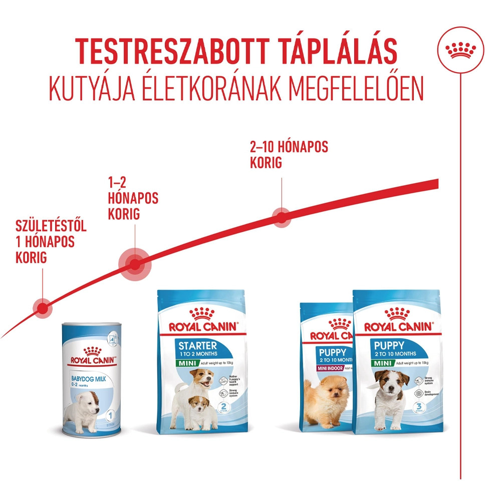 A ROYAL CANIN Mini Starter Mother & Babydog tápot kifejezetten az anyakutyák és kölyökkutyáik tápanyagszükségleteit szem előtt tartva fejlesztettük ki. A formula megfelelő a legfeljebb 10 kg testtömegű, kistestű felnőtt kutyák és az elválasztás alatt levő kölyökkutyák számára 2 hónapos korig.