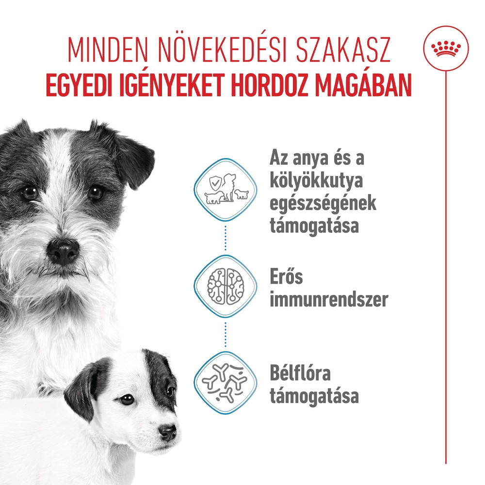 Royal Canin Mini Starter Mother & Babydog (4-10 kg) Száraz Kutyatáp • Támogatja az anyakutyát és a kölyökkutyát• Erős immunrendszer• Mikrobiom támogatása• Az agy fejlődéseAz újszülött kölyökkutyák tápanyagszükséglete különleges, hogy segítsen támogatni fejlődésben lévő érzékszerveiket és idegrendszerüket. Továbbá a növekedésben lévő kölyökkutyák táplálása komoly feladat, amely nagyban befolyásolhatja kistestű kutyája anyagcseréjét. Az elválasztási időszak során, amikor át lehet térni a szilárd táplálékra, az anyakutyának és kölykeinek testreszabott étrendre van szükségük, hogy kielégítsék különleges tápanyagszükségletüket.A ROYAL CANIN Mini Starter Mother & Babydog tápot kifejezetten az anyakutyák és kölyökkutyáik tápanyagszükségleteit szem előtt tartva fejlesztettük ki. A formula megfelelő a legfeljebb 10 kg testtömegű, kistestű felnőtt kutyák és az elválasztás alatt levő kölyökkutyák számára 2 hónapos korig.Ezt az egyedi étrendet kifejezetten ahhoz igazítottuk, hogy megfeleljen kistestű kutyája nagy energiaszükségletének a vemhesség végén és a szoptatás során. Valamint úgy fejlesztettük ki, hogy támogassa a kölyökkutyák egészséges fejlődését.Összetétele bizonyított komplexet tartalmaz, beleértve a C- és E-vitamint, amely támogatja az egészséges immunrendszer fejlődését.A jótékony hatású prebiotikumok (pl. MOS) és kitűnően emészthető fehérjék kombinációjának köszönhetően a ROYAL CANIN Mini Starter Mother & Babydog a bél-mikrobióta (bélflóra) egészséges egyensúlyát is támogatja a megfelelő emésztés érdekében.A formula Omega-3 zsírsavakban (pl. DHA) gazdag, amely tudományosan bizonyított módon támogatja a fiatal kölyökkutyák agyának egészséges fejlődését.A ROYAL CANIN Mini Starter Mother & Babydog tápot könnyű visszanedvesíteni vízzel, melytől étvágygerjesztő kása állaga lesz, amely ideális az elválasztandó kölyökkutyák számára.Tudta, hogy a kölyökkutyák tápanyagszükséglete változik, ahogy növekednek? A rövid, 8 hetes időszak során a kölyökkutyáknak olyan étrendre van szükségük, amely különösen a következő növekedési szakasz tápanyagszükségleteihez igazodik. Ebben a szakaszban át lehet térni a ROYAL CANIN Mini Puppy tápra, amely száraz tápszemcseként vagy nedves szószban kapható.A Royal Caninnál elkötelezettek vagyunk egy jobb világ megteremtése iránt a macskák és a kutyák számára. Több mint 50 éve dolgozunk szoros együttműködésben tenyésztőkkel, állatorvosokkal és kisállatszakértőkkel, megosztva egymással a szakmai tudást és a tudományos kutatásokat, hogy megteremtsük az egyedi, precíz, tápanyagokkal kapcsolatos megoldásokhoz való elkötelezett hozzáállást.Valamennyi termékünk esetében átfogó minőség-ellenőrzési eljárást folytatunk le, biztosítva az eledelek optimális minőségét. Amikor kistestű kutyája és kölykei ROYAL CANIN Mini Starter Mother & Babydog tápot esznek, teljes értékű és kiegyensúlyozott táplálékotkapnak.Összetétel: Rizs, dehidratált baromfifehérje, állati zsiradékok, búzaglutén*, hidrolizált állati fehérjék, kukorica, cukorrépapép, ásványi sók, szójaolaj, növényi rostok, halolaj, psyllium (útifű) maghéj és mag, frukto-oligoszacharidok, hidrolizált élesztő (mannán-oligoszacharidok és béta-glükánok forrása) (0,30 %), algaolaj Schizochytrium sp. (DHA forrás), vajsavsó, bársonyvirág por*L.I.P.: kitűnően emészthető, válogatott fehérjeAnalitikai összetevők: Nyersfehérje: 30,0 %, Zsírtartalom: 22,0 %, Nyershamu: 8,2 %, Nyersrost: 1,9 %, Omega-3 zsírsav (DHA): 0,19 %, E vitamin: 500 mg/kg, C vitamin: 400 mg/kgMetabolizálható energia: 4173 kcal/kgTápértékkel rendelkező adalékanyagok/kg: A vitamin: 18500 NE, D3 vitamin: 1200 NE, Vas (3b103): 42 mg, Jód (3b201, 3b202): 4,2 mg, Réz (3b405, 3b406): 13 mg, Mangán (3b502, 3b504): 54 mg, Cink (3b603, 3b605, 3b606): 135 mg, Szelén (3b801, 3b811, 3b812): 0,06 mgTechnológiai adalékanyagok/kg: Üledékes eredetű klinoptilolit: 10 g, Tartósítószerek, Antioxidánsok