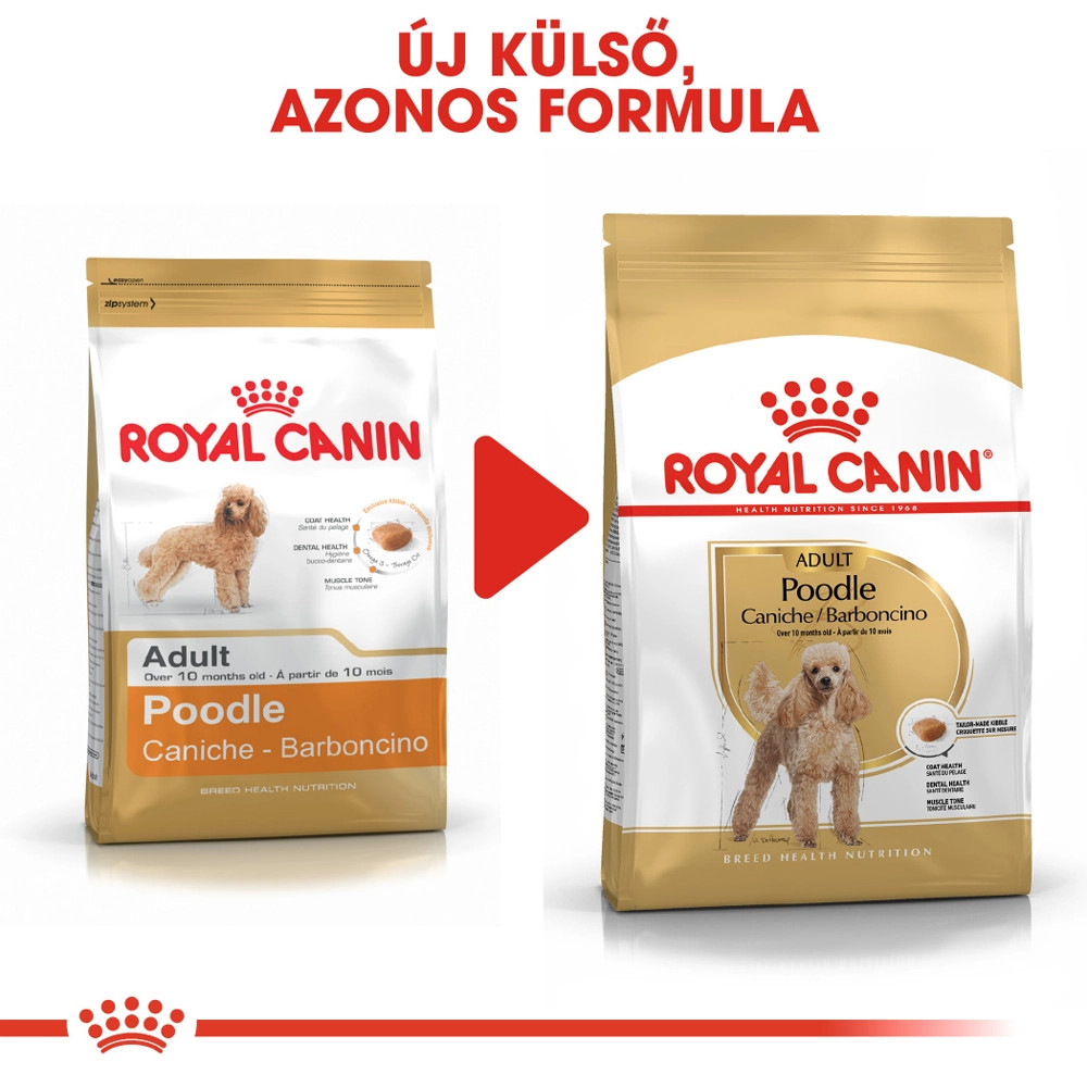 Royal Canin Poodle Adult Száraz Kutyatáp • Egészséges szőrzet• Egészséges fogak• Jó izomtónusA hosszú fülű és göndör szőrű uszkár fajtájú kutyák intelligens, éber és aktív társak, melyek eleganciát és büszkeséget sugároznak. Mivel minden fajta szükségletei eltérőek, fontos, hogy Ön milyen tápot választ uszkárja számára.Az optimális egészség támogatása érdekében a ROYAL CANIN’s Breed Health Nutrition (fajta szerinti egészséges táplálás) terméksora az egyedi és a sajátos igényeknek megfelelő tápokkal elégíti ki az egyes fajták konkrét táplálkozási igényeit.A ROYAL CANIN Poodle Adult tápot kifejezetten úgy állították össze, hogy kielégítse az Ön kutyája minden táplálkozási igényét.Az uszkár gyapjas szőrszálakból álló nagyon finom, könnyű és göndör szőrzettel rendelkezik. Mivel az uszkár szőre folyamatosan nő, a ROYAL CANIN Poodle Adult táp omega-3 zsírsavakat (EPA-t és DHA-t) és borágó olajat tartalmaz, mely tápanyagok – a táp gondosan beállított fehérjetartalmával együtt – támogatják az egészséges szőrnövekedést, valamint a pompás gyapjas bunda szépségének folyamatos megőrzését.A ROYAL CANIN Poodle Adult tápszemcséje a kalciummal kelátokat képező anyagokat tartalmaz, így kifejezetten úgy van kialakítva, hogy lassítsa a fogkőképződést és a fogkő felhalmozódását, így hozzájáruljon a kutya jó szájhigiéniájának fenntartásához.Ehhez társul még az is, hogy a táp összetétele segít megőrizni az uszkár jó izomtónusát.Az egyes kutyák egyedi ízlésének való megfelelés érdekében a ROYAL CANIN Poodle Adult egy puha és ízletes pástétom formájú nedves tápként is kapható.Ha Ön a nedves és a száraz táp kevert etetését fontolgatja, egyszerűen kövesse etetési útmutatónkat annak biztosításához, hogy kutyája az optimális előnyök érvényesülése érdekében pontosan a megfelelő mennyiségben kapja a nedves és a száraz tápot egyaránt.A ROYAL CANIN-nál mi elkötelezettek vagyunk amellett, hogy a kedvenc szükségleteinek megfelelő táplálási megoldásokat nyújtsunk. Minden termékünk átfogó minőségellenőrzési eljáráson esik át az optimális minőség biztosítása, illetve a kutya különleges diétás igényeinek és életmódjának való megfelelés érdekében. Ez azt jelenti, hogy az Ön ROYAL CANIN Poodle Adult tápot fogyasztó kutyája egy teljes értékű és kiegyensúlyozott tápot kap.Összetétel: Kukorica, dehidratált baromfifehérjék, búzaglutén*, állati zsiradékok, rizs, kukoricaliszt, kukoricaglutén, hidrolizált állati fehérjék, répapép, ásványi anyagok (ezen belül pentanátrium-trifoszfát (0,35 %)), szójaolaj, növényi rostok, halolaj, élesztőtermékek, frukto-oligoszacharidok, borágóolaj (0,1 %), erjesztéssel előállított glükózamin, bársonyvirág por, hidrolizált porc (kondroitin forrás)*L.I.P.: kitűnően emészthető, válogatott fehérjeAnalitikai összetevők: Nyersfehérje: 30,0 %, Nyersrost: 2,1 %, Zsírtartalom: 19,0 %, Nyershamu: 5,5 %, Omega-3 zsírsavak: 0,8 %, EPA/DHA: 0,3 %Táplálkozási adalékanyagok/kg: A-vitamin: 29700 NE, D3-vitamin: 800 NE, Vas (3b103): 40 mg, Jód (3b201, 3b202): 4 mg, Réz (3b405, 3b406): 12 mg, Mangán (3b502, 3b504): 53 mg, Cink (3b603, 3b605, 3b606): 139 mg, Szelén (3b801, 3b811, 3b812): 0,09 mgTechnológiai adalékanyagok/kg: Üledékes eredetű klinoptilolit: 5 g, Tartósítószerek, Antioxidánsok