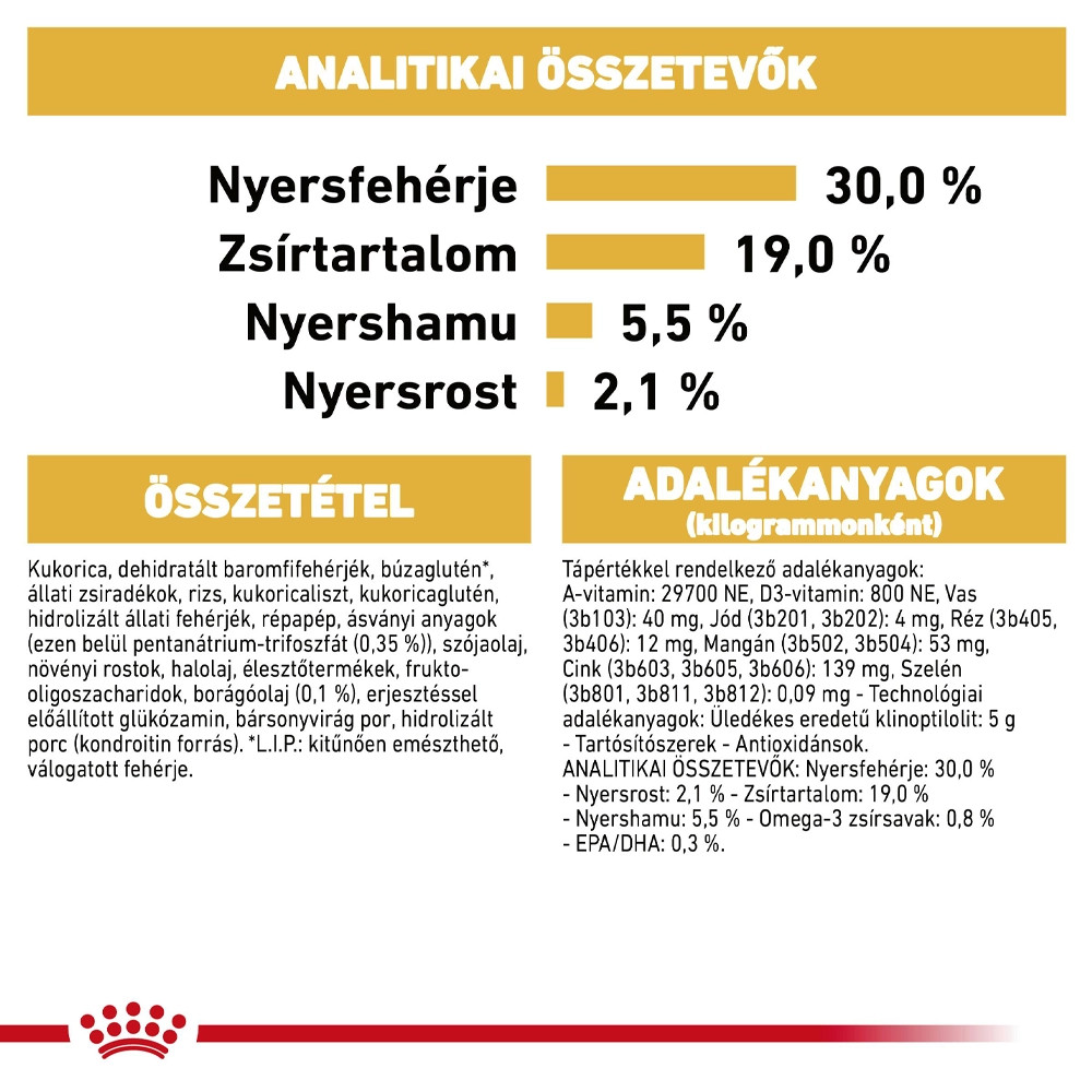 Royal Canin Poodle Adult Száraz Kutyatáp • Egészséges szőrzet• Egészséges fogak• Jó izomtónusA hosszú fülű és göndör szőrű uszkár fajtájú kutyák intelligens, éber és aktív társak, melyek eleganciát és büszkeséget sugároznak. Mivel minden fajta szükségletei eltérőek, fontos, hogy Ön milyen tápot választ uszkárja számára.Az optimális egészség támogatása érdekében a ROYAL CANIN’s Breed Health Nutrition (fajta szerinti egészséges táplálás) terméksora az egyedi és a sajátos igényeknek megfelelő tápokkal elégíti ki az egyes fajták konkrét táplálkozási igényeit.A ROYAL CANIN Poodle Adult tápot kifejezetten úgy állították össze, hogy kielégítse az Ön kutyája minden táplálkozási igényét.Az uszkár gyapjas szőrszálakból álló nagyon finom, könnyű és göndör szőrzettel rendelkezik. Mivel az uszkár szőre folyamatosan nő, a ROYAL CANIN Poodle Adult táp omega-3 zsírsavakat (EPA-t és DHA-t) és borágó olajat tartalmaz, mely tápanyagok – a táp gondosan beállított fehérjetartalmával együtt – támogatják az egészséges szőrnövekedést, valamint a pompás gyapjas bunda szépségének folyamatos megőrzését.A ROYAL CANIN Poodle Adult tápszemcséje a kalciummal kelátokat képező anyagokat tartalmaz, így kifejezetten úgy van kialakítva, hogy lassítsa a fogkőképződést és a fogkő felhalmozódását, így hozzájáruljon a kutya jó szájhigiéniájának fenntartásához.Ehhez társul még az is, hogy a táp összetétele segít megőrizni az uszkár jó izomtónusát.Az egyes kutyák egyedi ízlésének való megfelelés érdekében a ROYAL CANIN Poodle Adult egy puha és ízletes pástétom formájú nedves tápként is kapható.Ha Ön a nedves és a száraz táp kevert etetését fontolgatja, egyszerűen kövesse etetési útmutatónkat annak biztosításához, hogy kutyája az optimális előnyök érvényesülése érdekében pontosan a megfelelő mennyiségben kapja a nedves és a száraz tápot egyaránt.A ROYAL CANIN-nál mi elkötelezettek vagyunk amellett, hogy a kedvenc szükségleteinek megfelelő táplálási megoldásokat nyújtsunk. Minden termékünk átfogó minőségellenőrzési eljáráson esik át az optimális minőség biztosítása, illetve a kutya különleges diétás igényeinek és életmódjának való megfelelés érdekében. Ez azt jelenti, hogy az Ön ROYAL CANIN Poodle Adult tápot fogyasztó kutyája egy teljes értékű és kiegyensúlyozott tápot kap.Összetétel: Kukorica, dehidratált baromfifehérjék, búzaglutén*, állati zsiradékok, rizs, kukoricaliszt, kukoricaglutén, hidrolizált állati fehérjék, répapép, ásványi anyagok (ezen belül pentanátrium-trifoszfát (0,35 %)), szójaolaj, növényi rostok, halolaj, élesztőtermékek, frukto-oligoszacharidok, borágóolaj (0,1 %), erjesztéssel előállított glükózamin, bársonyvirág por, hidrolizált porc (kondroitin forrás)*L.I.P.: kitűnően emészthető, válogatott fehérjeAnalitikai összetevők: Nyersfehérje: 30,0 %, Nyersrost: 2,1 %, Zsírtartalom: 19,0 %, Nyershamu: 5,5 %, Omega-3 zsírsavak: 0,8 %, EPA/DHA: 0,3 %Táplálkozási adalékanyagok/kg: A-vitamin: 29700 NE, D3-vitamin: 800 NE, Vas (3b103): 40 mg, Jód (3b201, 3b202): 4 mg, Réz (3b405, 3b406): 12 mg, Mangán (3b502, 3b504): 53 mg, Cink (3b603, 3b605, 3b606): 139 mg, Szelén (3b801, 3b811, 3b812): 0,09 mgTechnológiai adalékanyagok/kg: Üledékes eredetű klinoptilolit: 5 g, Tartósítószerek, Antioxidánsok