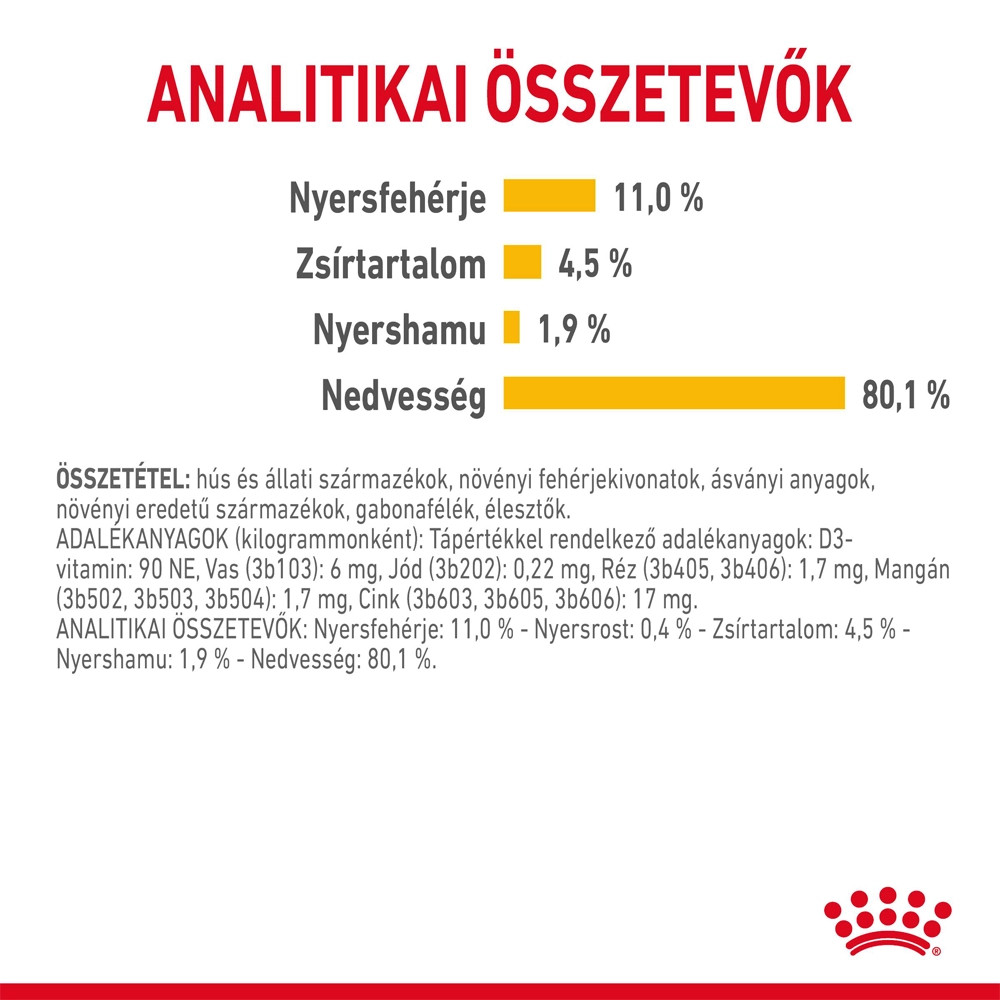 Royal Canin Sensory Taste Jelly Alutasakos Macskaeledel • Az ízérzet stimulálása• Érzékszervi stimuláció• Ösztönösen előnyben részesített• Egészséges húgyutakBár a macskák kevesebb ízlelőbimbóval rendelkeznek és az ízlelés nem a legerősebb érzékük, akkor is különlegesen speciális. Mivel a macska eredetileg ragadozó állat, ezért különösen érzékenyek a táplálék húsos, zamatos jegyeire. Még ha kevesebb féle ízt képesek is megkülönböztetni, akkor is igen érzékenyek bizonyos ízekre.Jelentősen javítja macskája egészségi állapotát és közérzetét az, ha tápláléka nemcsak tápláló, hanem az érzékszerveire is változatosan hat. A ROYAL CANIN Sensory Taste formula ízét erőteljes pirított, húsos és karamellizált jegyek jellemzik, melyek igen erős ingert nyújtanak macskája különleges ízérzékelésére, így az etetés különleges élményt nyújt az állat érzékszerveinek.A ROYAL CANIN Sensory termékcsaládjának további termékei a Sensory Smell és a Sensory Feel. Vonzó összetételének köszönhetően mindegyik termék igazán étvágygerjesztő, és stimulálja a macska érzékszerveit.A táp összetétele igazodik ahhoz az optimális makrotápanyag-összetételhez, melyet ösztönösen előnyben részesítenek a felnőtt macskák.A formula olyan tápanyagok kombinációját is tartalmazza, amelyek segítenek támogatni a felnőtt macskák húgyúti egészségét.Ha felváltva eteti macskáját nedves és száraz eledellel, még változatosabb textúrákat kínálhat számára, ezáltal még jobban segíthet stimulálni az étvágyát. A nedves és száraz eledelt egyaránt tartalmazó étrend válogatós macskák esetében is jó választás. A megfelelő etetési adag érdekében mindenképpen kövesse az etetési útmutatót. A Sensory™ nedves tápok bármelyik Feline Health Nutrition Adult száraz tápunkkal kombinálható.A ROYAL CANIN vállalatnál elkötelezettek vagyunk a kisállatok szükségleteinek megfelelő táplálási megoldások nyújtása iránt. Valamennyi termékünk esetében átfogó minőség-ellenőrzési eljárást folytatunk le, biztosítva az eledelek optimális minőségét valamint, hogy megfeleljenek macskája speciális táplálási igényeinek és életmódjának. Ez azt jelenti, hogy amikor macskája ROYAL CANIN® Sensory Taste tápot eszik, teljes értékű és kiegyensúlyozott összetételű táplálékot fogyaszt.Összetétel: Hús és állati származékok, növényifehérje-kivonatok, ásványianyagok, növényi eredetű származékok, élesztők, különféle cukrokAnalitikai összetevők: Fehérje: 11.0%, Zsírtartalom: 4.5%, Nyershamu: 1.8%, Nyersrost: 0.5%, Nedvességtartalom: 80.2%Táplálkozási adalékanyagok/kg: D3-vitamin: 100 NE, Vas (3b103): 5 mg, Jód (3b202): 0,26 mg, Réz (3b405, 3b406): 2,1 mg, Mangán (3b502, 3b503, 3b504): 1,6 mg, Cink (3b603, 3b605,3b606): 16 mg