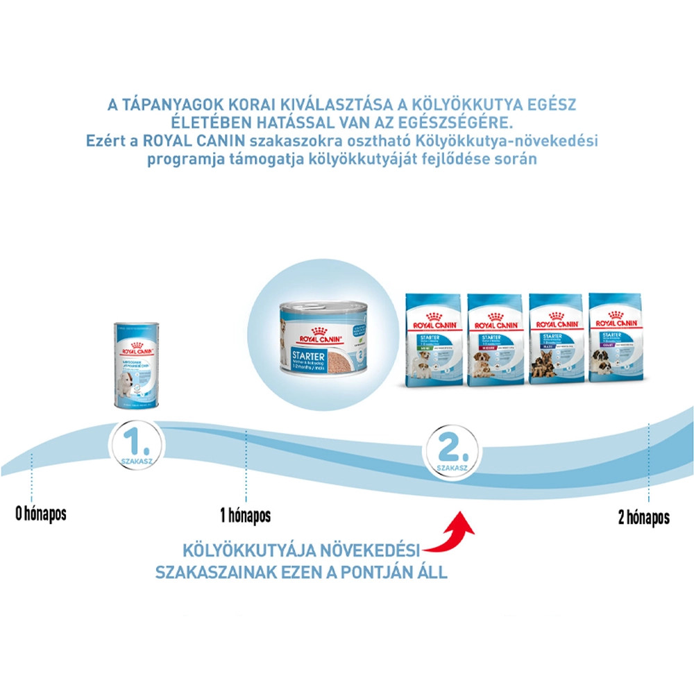 Royal Canin Wet Starter Mousse Kutyaeledel • Kölyökkutyabarát íz és állag• Az agy fejlődése• Erős immunrendszer• Mikrobiom támogatásaAz újszülött kölyökkutyák tápanyagszükséglete különleges, hogy segítsen támogatni fejlődésben lévő érzékszerveiket és idegrendszerüket. Továbbá a növekedésben lévő kölyökkutyák táplálása komoly feladat, amely nagyban befolyásolhatja az anyakutya anyagcseréjét. Az elválasztási időszak során, amikor át lehet térni a szilárd táplálékra, az anyakutyának és kölykeinek testreszabott étrendre van szükségük, hogy kielégítse egyedülálló tápanyagszükségletüket.A ROYAL CANIN Starter Mousse Mother & Babydog tápot kifejezetten a vemhes és szoptató anyakutyák és legfeljebb 2 hónapos korú, elválasztás alatt levő kölyökkutyáik tápanyagszükségleteit szem előtt tartva fejlesztettük ki.Ez az egyedi étrend ultakönnyű habkrém állagú, amelyet a kölyökkutyák emésztőrendszeréhez igazítottunk és amely segíti az áttérést a szilárd táplálékra. Rendkívül tápanyagdús mind a kölyökkutyák, mind az anyakutya számára. A ROYAL CANIN Starter Mousse Mother & Babydog Omega-3 zsírsavakban (DHA) gazdag, és bizonyított módon támogatja az agy fejlődését, valamint segíti a kölyökkutyák korai tanulását.Összetétele bizonyított komplexet tartalmaz, beleértve a C- és E-vitamint, amely támogatja az egészséges immunrendszer fejlődését.A jótékony hatású prebiotikumok (pl. MOS) és kitűnően emészthető fehérjék kombinációjának köszönhetően a ROYAL CANIN Starter Mousse Mother & Babydog a bél-mikrobióta (bélflóra) egészséges egyensúlyát is támogatja a megfelelő emésztés érdekében.A ROYAL CANIN Starter Mousse Mother & Babydog egyenletes állaga segíti a hidratáltságot és kifejezetten alkalmas a kisebb vagy gyengébbnek tűnő kölyökkutyák elválasztásához.Tudta, hogy a kölyökkutyák tápanyagszükséglete változik, ahogy növekednek? Mire elérik a 2 hónapos kort, a kölyökkutyáknak olyan étrendre van szükségük, amely különösen a következő növekedési szakasz tápanyagszükségleteihez igazodik. Ebben a szakaszban át lehet térni a megfelelő ROYAL CANIN étrendre, a várható testméretétől függően (X-Small, Mini, Medium, Maxi vagy Giant). Az étrend kapható száraz tápszemcseként és nedves Mini, Medium, Maxi szószban (pecsenyelében).A Royal Caninnál elkötelezettek vagyunk egy jobb világ megteremtése iránt a macskák és a kutyák számára. Több mint 50 éve dolgozunk szoros együttműködésben tenyésztőkkel, állatorvosokkal és kisállatszakértőkkel, megosztva egymással a szakmai tudást és a tudományos kutatásokat, hogy megteremtsük az egyedi, precíz, tápanyagokkal kapcsolatos megoldásokhoz való elkötelezett hozzáállást.Valamennyi termékünk esetében átfogó minőség-ellenőrzési eljárást folytatunk le, biztosítva az eledelek optimális minőségét. Amikor kutyája és kölykei ROYAL CANIN Starter Mousse Mother & Babydog tápot esznek, teljes értékű és kiegyensúlyozott táplálékot kapnak.Összetétel: Hús és állati származékok, gabonafélék, növényi eredetű származékok, ásványi sók, olajok és zsírok, tej és tejszármazékok, élesztőkAnalitikai összetevők: Nyersfehérje 10,0 %, Zsírtartalom 6,0 %: Nyershamu: 2,0 %, Nyersrost: 0,7 %, Nedvesség: 78,5 %Tápértékkel rendelkező adalékanyagok/kg: D3 vitamin: 170 NE, Vas (3b103): 6 mg, Jód (3b202): 0,3 mg, Réz (3b405, 3b406): 2,5 mg, Mangán (3b502, 3b503, 3b504): 1,7 mg, Cink (3b603, 3b605, 3b606): 17 mgTechnológiai adalékanyagok/kg: Üledékes eredetű klinoptilolit: 2 g