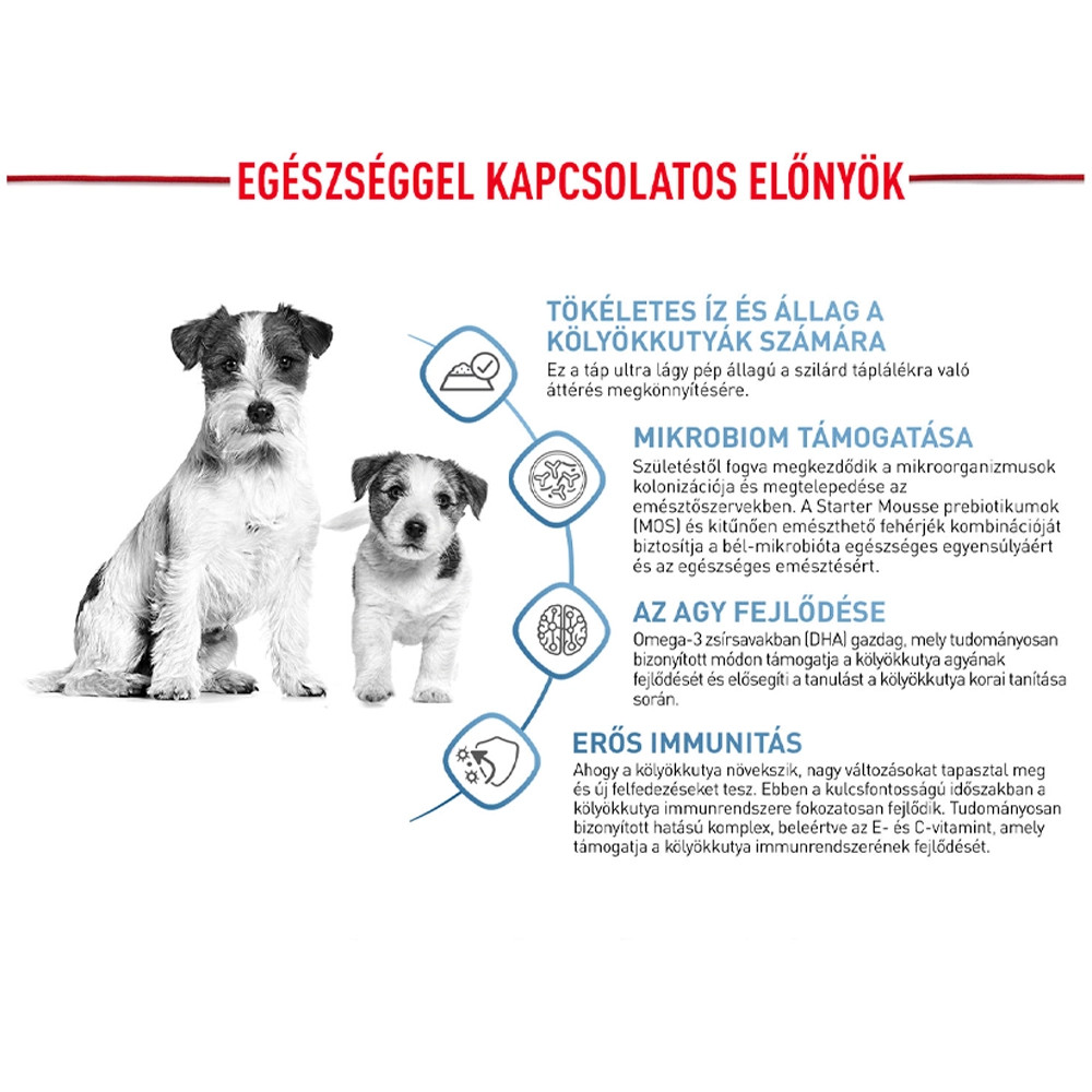 A ROYAL CANIN Starter Mousse Mother & Babydog Omega-3 zsírsavakban (DHA) gazdag, és bizonyított módon támogatja az agy fejlődését, valamint segíti a kölyökkutyák korai tanulását.