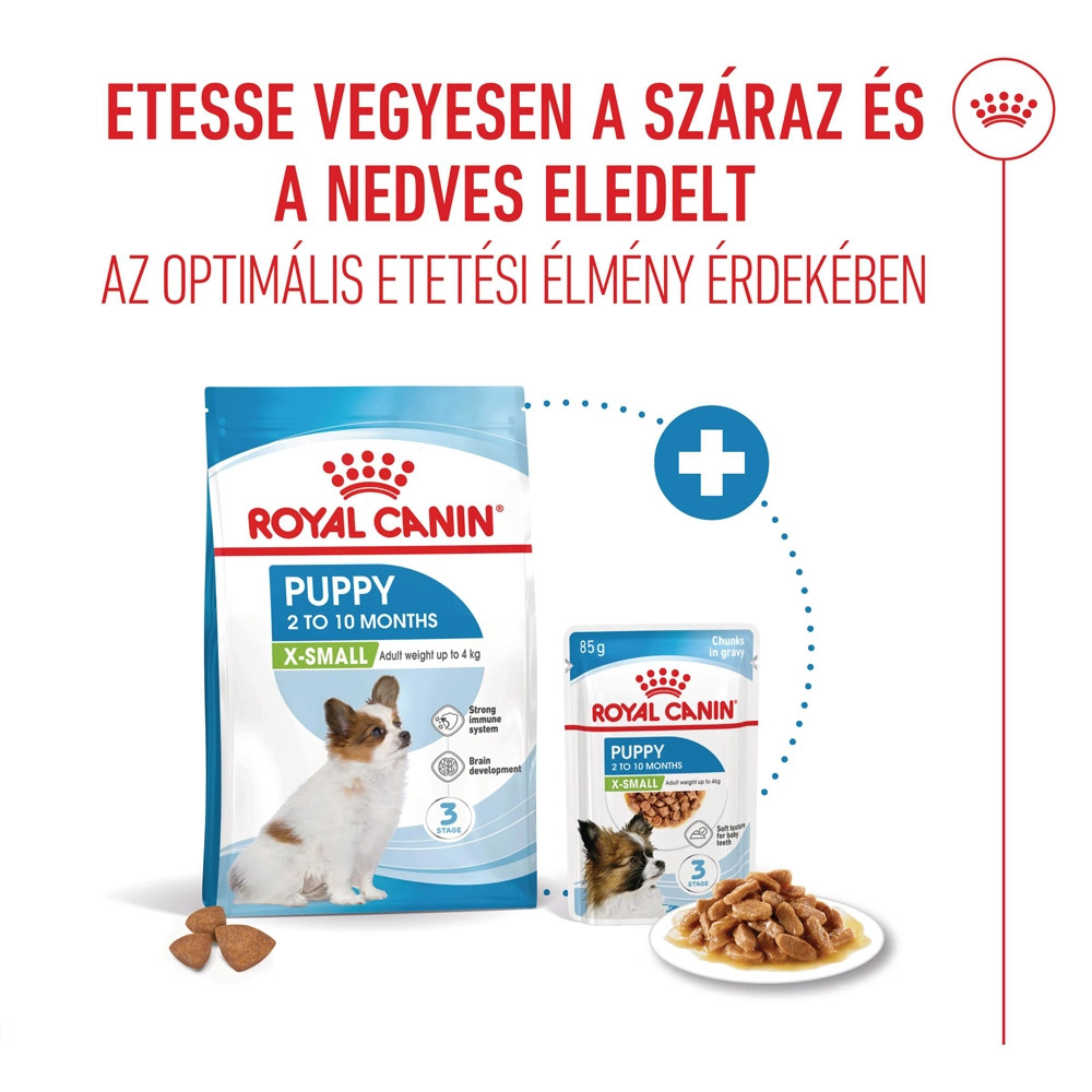 A ROYAL CANIN X-Small Puppy tápot kifejezetten az extra kistestű kölyökkutyák tápanyagszükségleteit szem előtt tartva fejlesztettük ki. Összetétele megfelelő a 2-10 hónapos kölyökkutyák számára, amelyeknek legfeljebb 4 kg felnőttkori testsúlyt kell elérniük.