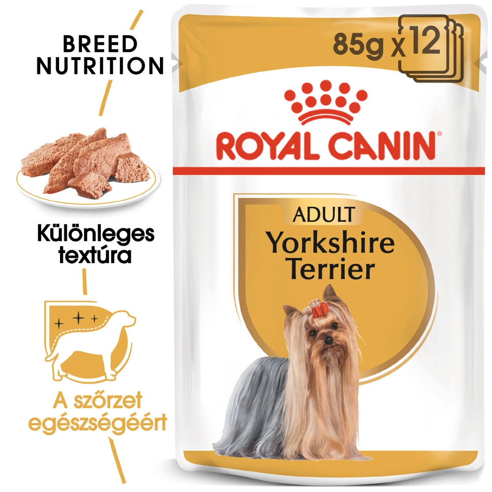 Royal Canin Yorkshire Terrier Adult Alutasakos Kutyaeledel • Egészséges szőrzet• Étvágyserkentő hatás• Jó bélsárminőségA yorkshire terrierek vagy „yorkik” természetüknél fogva kiegyensúlyozott vérmérsékletű, aktív és intelligens kutyák, tele energiával és életkedvvel.A yorkshire terrier legismertebb jellemzője a szembeötlően szép szőrzet. A ló szőrére emlékeztető szőrzet kivételesen finom és hosszú, és soha nem hagyja abba a növekedést. A yorki soha nem vedlik, és gyönyörű bundája különleges tápanyagokat igényel ahhoz, hogy puha és selymes maradjon.A ROYAL CANIN Yorkshire Terrier in Loaf (pástétom formájú) tápot kifejezetten a felnőtt yorkshire terrier tápanyagszükségleteinek szem előtt tartásával állították össze, és az 10 hónapos kor felett etethető.A ROYAL CANIN Yorkshire Terrier in Loaf (pástétom formájú) táp hozzájárul a bőr és a hosszú szőrzet egészségesen tartásához. A táp a gondosan kiválogatott, optimális hatású tápanyagok különleges elegyét tartalmazza annak érdekében, hogy segítsen a kutyának megőrizni fénylő és csillogó bundáját. A táp pontosan beállított tápanyagtartalma révén támogatja az egészséges emésztést is.Ezért a ROYAL CANIN Yorkshire Terrier in Loaf (pástétom formájú) táp állagát úgy alakították ki, hogy az fokozza a táp ízletességét és segítsen serkenteni a kutya étvágyát. Ennek az ízletes pástétomnak az illata és a puhasága megfelel még a legválogatósabb yorkshire terrierek ízlésének is!Az egyes kutyák egyedi ízlésének való megfelelés érdekében a ROYAL CANIN Yorkshire Terrier in Loaf (pástétom formájú) táp ropogós és ízletes tápszemcséjű száraz táp formájában is kapható.Ha Ön a nedves és a száraz táp kevert etetését fontolgatja, egyszerűen kövesse etetési útmutatónkat annak biztosítása érdekében, hogy kutyája az optimális előnyök érvényesülése érdekében pontosan a megfelelő mennyiségben kapja a nedves és a száraz tápot egyaránt.A ROYAL CANIN-nál mi elkötelezettek vagyunk amellett, hogy a kedvenc szükségleteinek megfelelő táplálási megoldásokat nyújtsunk. Minden termékünk átfogó minőségellenőrzési eljáráson esik át a tápok optimális minőségének biztosítása, illetve a kutya különleges diétás igényeinek és életmódjának való megfelelés érdekében. Ez azt jelenti, hogy az Ön ROYAL CANIN Yorkshire Terrier in Loaf (pástétom) tápot fogyasztó kutyája egy teljes értékű és kiegyensúlyozott tápot kap. Összetétel: Hús és állati származékok, növényi eredetű származékok, gabonafélék, ásványi anyagok, olajok és zsírokAnalitikai összetevők: Nyersfehérje: 8,7 %, Nyersrost: 1,3 %, Zsírtartalom: 6,1 %, Nyershamu: 2,3 %, Nedvesség: 78,0 %Tápértékkel rendelkező adalékanyagok/kg: D3-vitamin: 160 NE, Vas (3b103): 11 mg, Jód (3b202): 0,19 mg, Réz (3b405, 3b406): 1,5 mg, Mangán (3b502, 3b503, 3b504): 3,2 mg, Cink (3b603, 3b605, 3b606): 32 mgTechnológiai adalékanyagok/kg: Üledékes eredetű klinoptilolit: 2,2 g